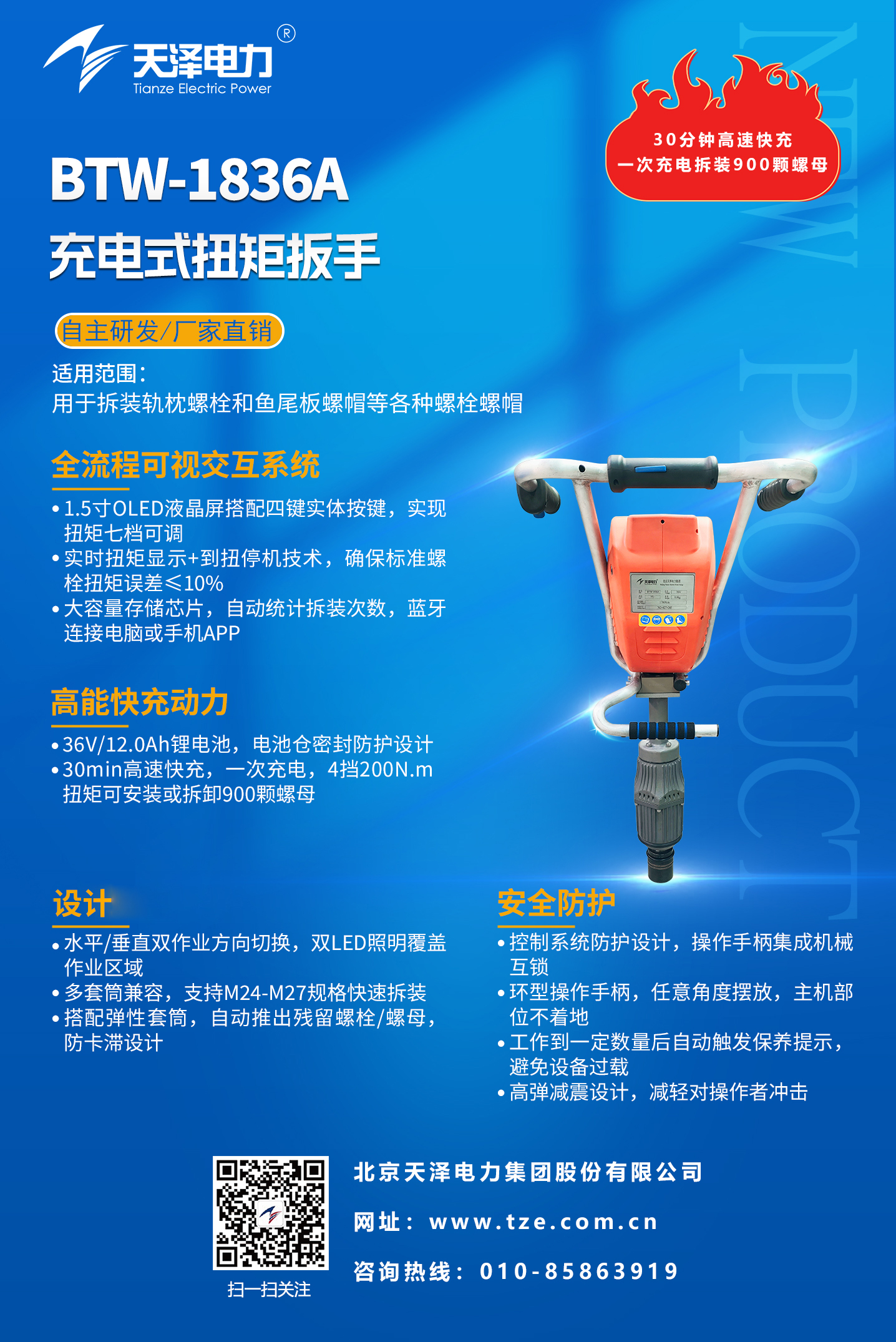 扭矩扳手是铁路钢轨螺栓、螺母拧紧和旋松的必备工具,是铁道工务电务建设、维修及抢修作业的专业工具,适用于铁路的线路改造、运维以及新建铁路的螺栓螺母作业。天泽电力自主研发的充电式扭矩扳手btw-1836a, 设定最大螺栓旋紧扭矩350n.m,拆卸螺栓扭矩1700n.m, 适用于m24-m27的所有螺栓型号拆装。